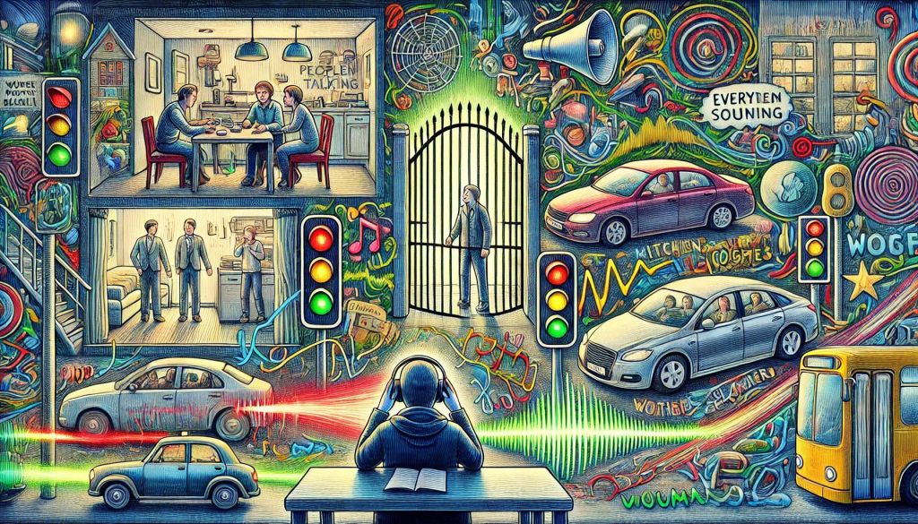 A detailed scene of a person surrounded by a vivid soundscape. Inside a house, people are talking, kitchen noises like pans clacking and utensils being washed are heard. A TV is playing music, and a water cooler is filling a glass. Outside, a gate is opening with a car driving off. Traffic lights blink red, green, and yellow, while other cars screech their brakes. The person is sitting on a bus, hearing the hum of the air conditioner and engine, all blending together into a symphony of everyday sounds.